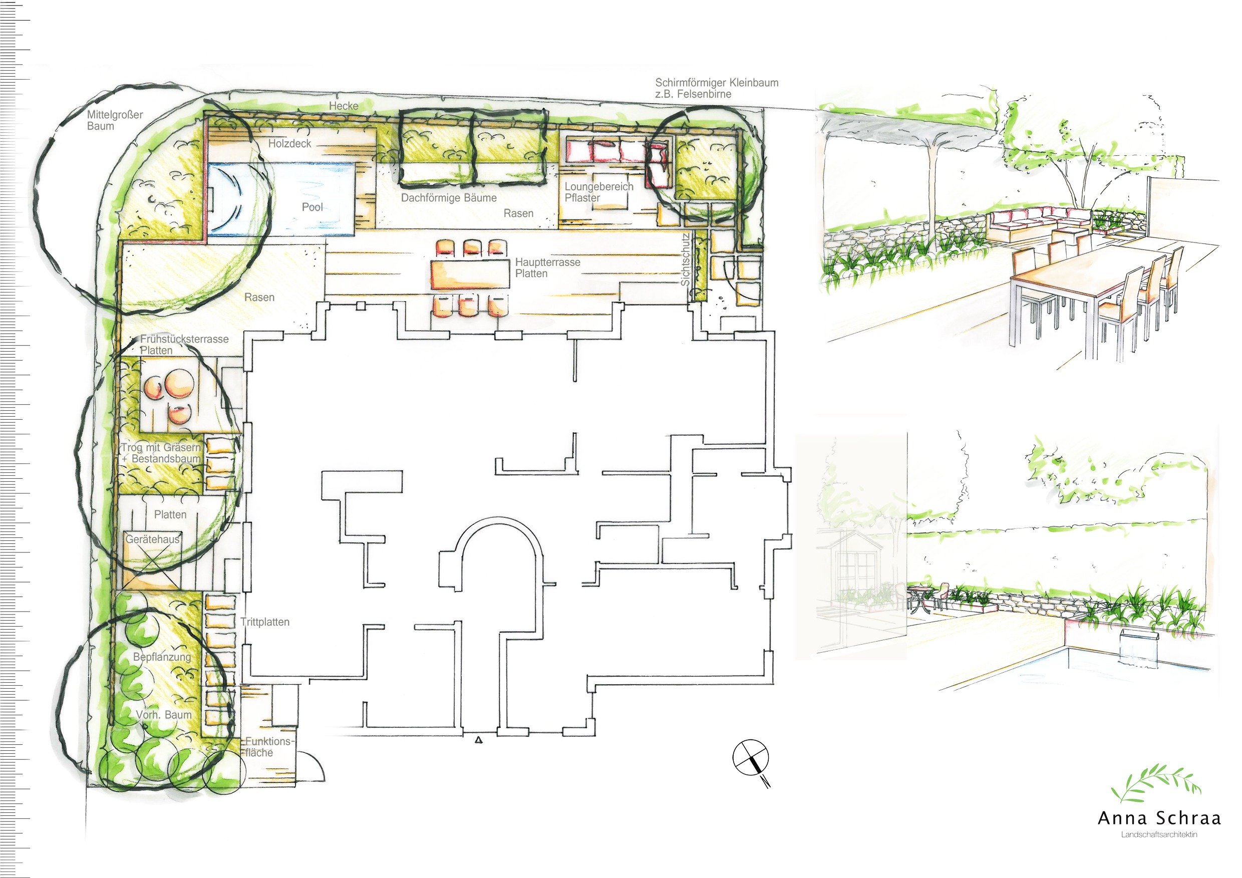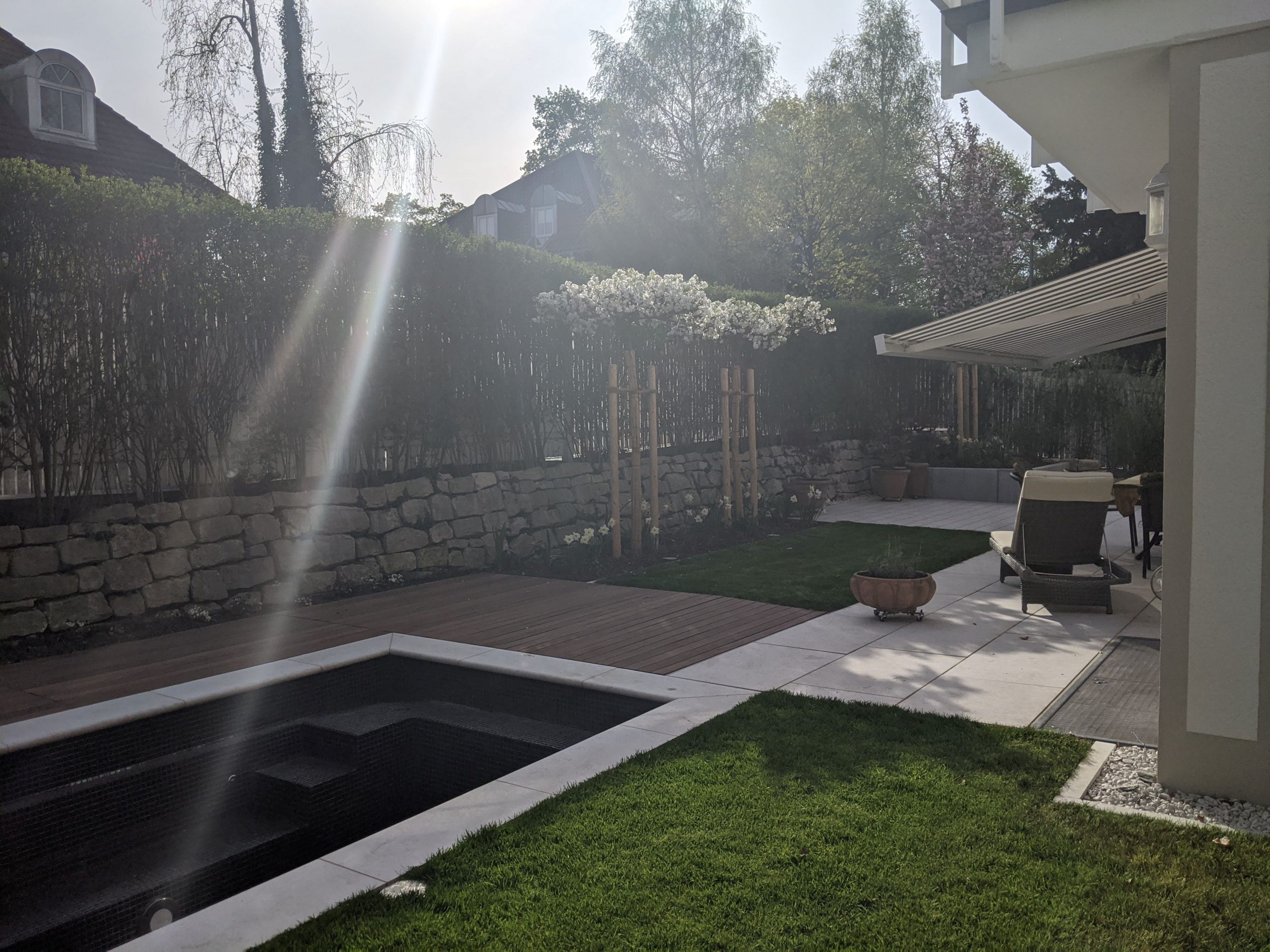Der Garten wurde bis auf die Natursteinmauer komplett umgeplant und in mehrere Bereich aufgeteilt. Ein Highlight in dem Garten ist der Mini-Pool mit Mosaikfliesen und einem Wasserschwaller der direkt aus dem Hochbeet kommt. Diese erfüllen außerdem den Zweck, den bestehenden Höhenunterschied zwischen der Gartenebene und der bestehenden Mauer mit Hecke zu kaschieren. Die Einfassungen mit Mauerscheiben aus Beton bieten einen guten Kontrast zu der bestehenden Natursteinmauer. Sie können optional mit Cortenstahl verkleidet werden. Direkt am Wohnzimmer gibt es eine großzügige Terrasse mit Natursteinplatten aus Kanfanar und dazu angrenzend einen Loungbereich ebenfalls aus Kanfanar in einem kleineren Format. Um den langezogenen Garten optisch zu unterbrechen, wurden zwei Zieräpfel in Dachform hinterhalb der Rasenfläche eingeplant